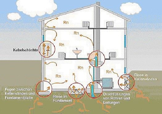 Wesentlich beeinflusst wird die Radon-Konzentration in der Raumluft durch die Bodenluft, die über undichte Stellen im Fundament und in den Wänden in die Räume eindringen kann. Die Radonfreisetzung aus uranhaltigen Baustoffen spielt in den allermeisten Fällen demgegenüber nur eine untergeordnete Rolle.