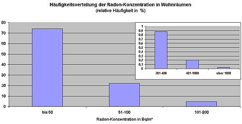 Bundesweite Messungen in über 9000 Wohnungen haben ergeben, dass die Radon-Konzentration in der Raumluft im Mittel bei 50 bis 100 Becquerel pro Kubikmeter (Bq/m³) liegt. Bei einer Schwankungsbreite der Messwerte von einigen Bq/m³ bis zu einigen 10 000 Bq/m³ hat die Häufigkeitsverteilung der Radon-Konzentration in Wohnräumen den in der Abbildung dargestellten Verlauf.