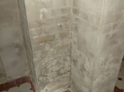 Die Einspeisung erfolgt über sogenannte Endlosanoden. Bereits nach einem Jahr konnte das 60 cm dicke Sandsteinmauerwerk größtenteils trocken übergeben werden. Herr Prof.Dr.B. kennt sich als Physiker gut aus mit dem Verfahren. Drymat brachte den Minuspol ( mehrere Kathoden) unter dem Fussboden ein. Die Abdichtungsebene liegt somit unter dem Haus - der Boden kann trocknen. Im Bereich des alten Schornsteines treten ehemals im Wasser gelöste Schadsalze an der Oberfläche aus, ein typisches Zeichen für die Abtrocknung. Die Trocknung schreitet künftig weiter voran. Die Anlage verbleibt als aktive Sperre gegen aufsteigende Feuchte im Haus. Bereits wenige Watt ( vergleichbar mit einem Klingeltrafo ) reichen aus um das Gebäude langfristig trocken zu halten.